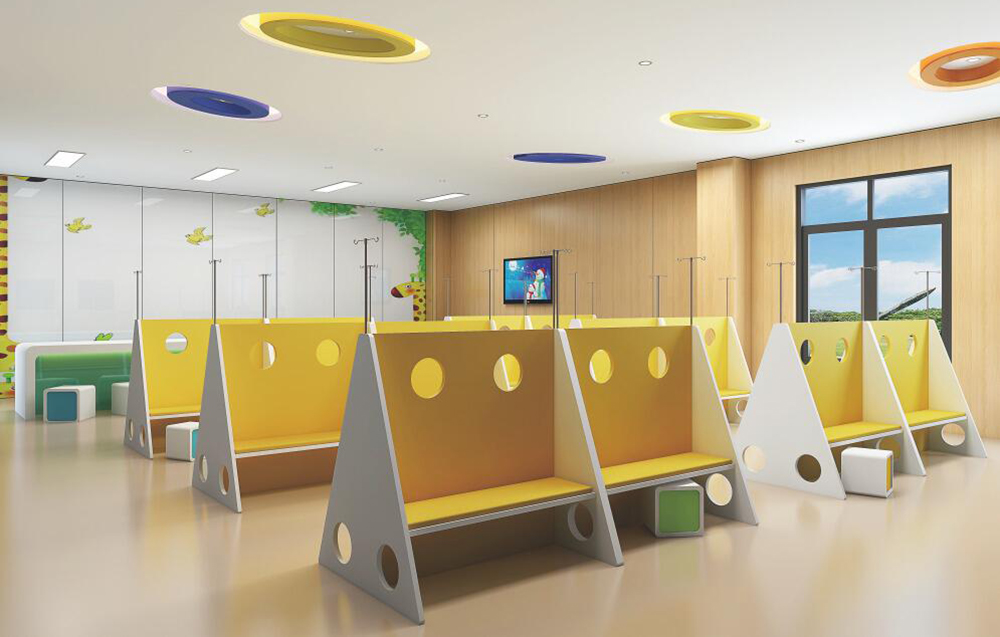 輸液區(qū)是用于急診、門診輸液的治療單元,實際設計時可多元套用,需與皮試肌注室、護士站、輸液配劑室臨近。設計時需注意座椅間距,需滿足治療車通過、護士靜脈注射等操作所需空間。